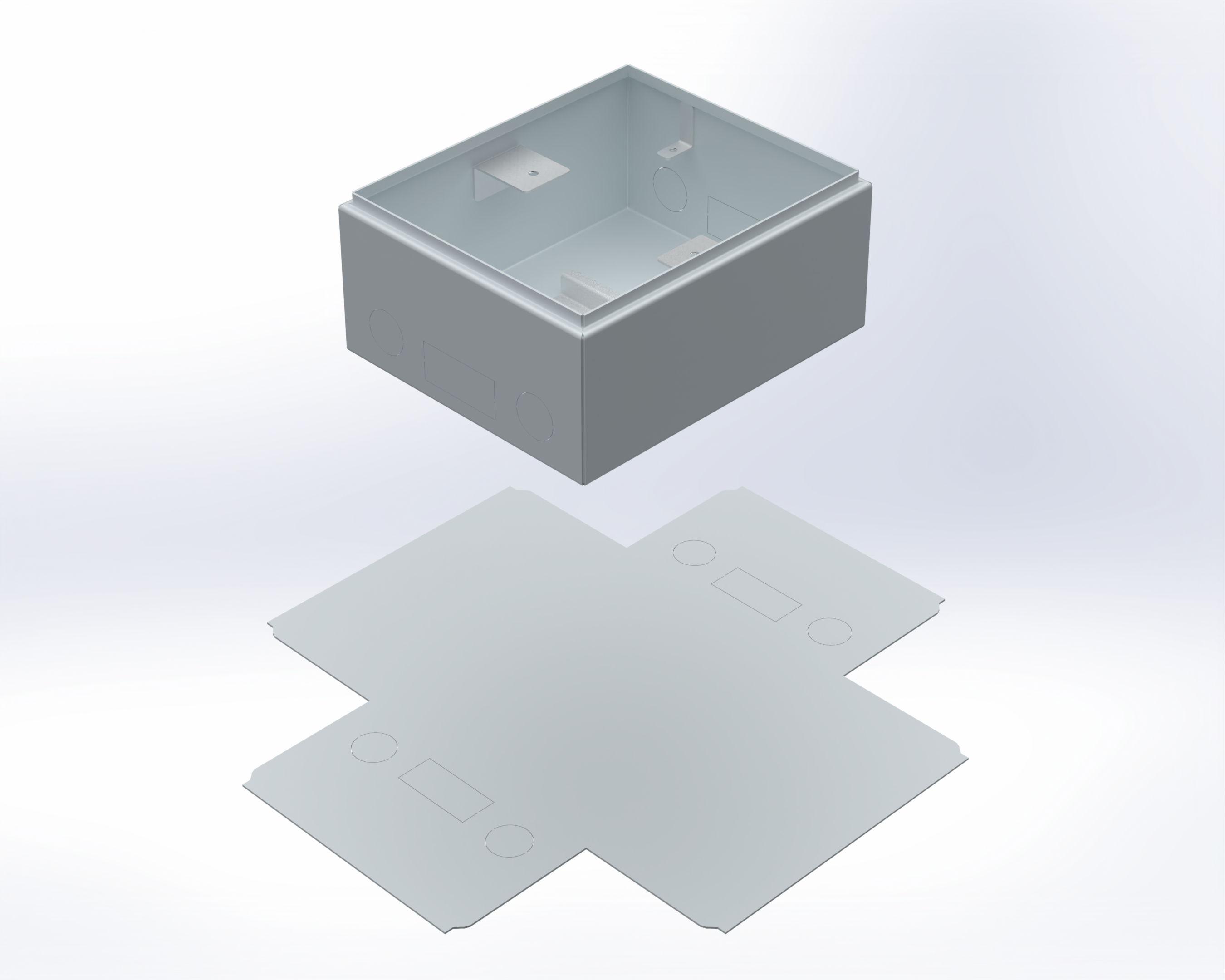 Created a cost-effective enclosure from a single piece of sheet metal. The design is optimized for fabrication, with clear flat patterns, proper bend reliefs, and spot welding callouts for efficient production.