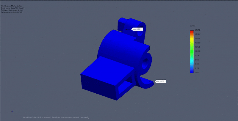 Performed a linear static analysis on the switch mechanism to validate its durability under typical operating forces. This early-stage simulation confirmed the design’s robustness and identified key stress points.